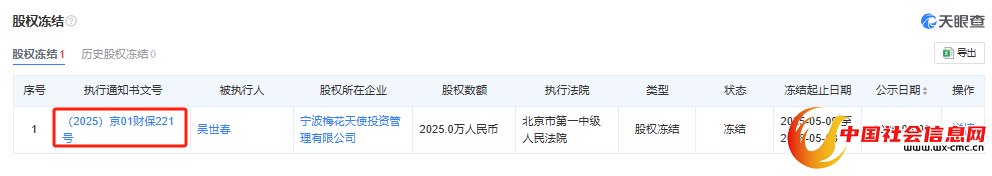 红星资本局6月24日消息,天眼查APP显示,梅花创投的创始合伙人吴世春持有的部分股权被北京市第一中级人民法院冻结,相关执行通知书文号为(2025)京01财保221号。