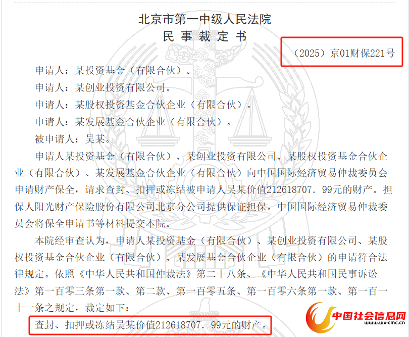 经北京市第一中级人民法院审查,裁定:查封、扣押或冻结吴某价值约2.13亿元的财产。