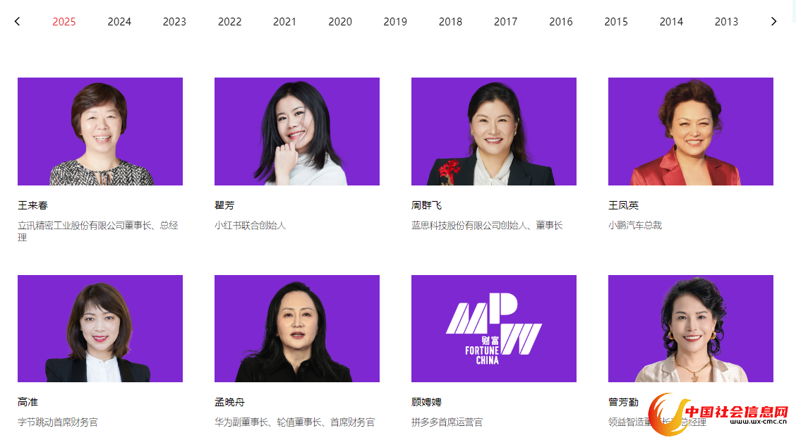 另外,在2025年榜单中,包括小鹏汽车总裁王凤英、华为副董事长孟晚舟、京东集团首席执行官兼执行董事许冉、宏胜饮料集团总裁宗馥莉等多个行业熟悉的高层相继入选。其中,孟晚舟在榜单排名第六。