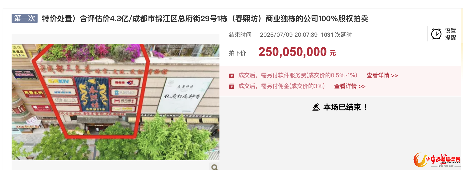 7月9日,微成都从阿里资产拍卖平台获悉,经过1032轮出价,成都东风商贸广场有限公司100%股权最终被竞买号为“N1742”的竞买人,以约2.5亿元的价格拍下。该公司核心资产为位于锦江区总府街上的商业独栋建筑——春熙坊,其评估价为4.3亿元。