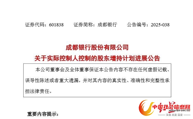 7月9日,成都银行(601838.SH)发布公告,披露其实控人成都市国资委控制的股东增持计划最新进展。