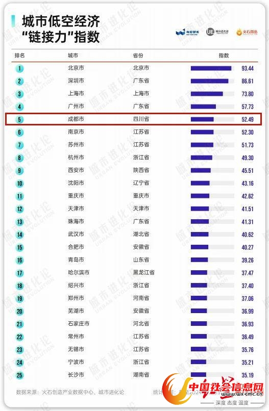 微成都报道7月8日,《城市低空经济“链接力”指数(2025)》(以下简称《报告》)发布,公布了低空经济“链接力”指数50强及企业聚集度、资本活跃度、创新聚集度和环境友好度四大细分指数50强的评价结果。其中,成都以52.49的指数得分排名全国第五。