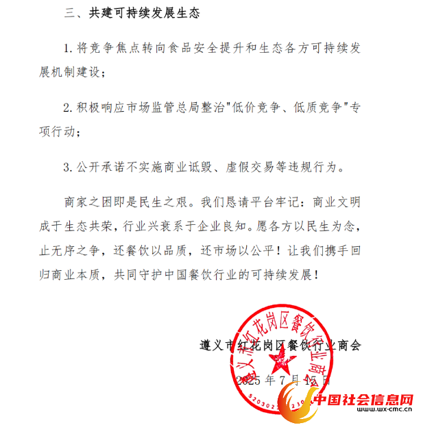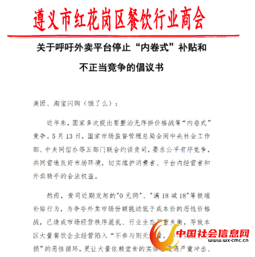 7月15日消息, 今日,贵州遵义红花岗区餐饮行业商会发文,呼吁外卖平台停止“内卷式”补贴和不正当竞争,对象指向美团和淘宝闪购。