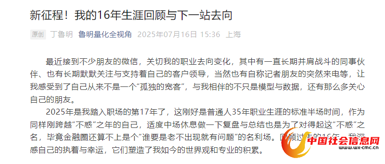 7月16日消息,今日下午,中信建投证券(601066.SH;6066.HK)前知名首席分析师丁鲁明在个人公众号“鲁明量化全视角”发文回顾自己16年的从业生涯,并宣布“奔私”。