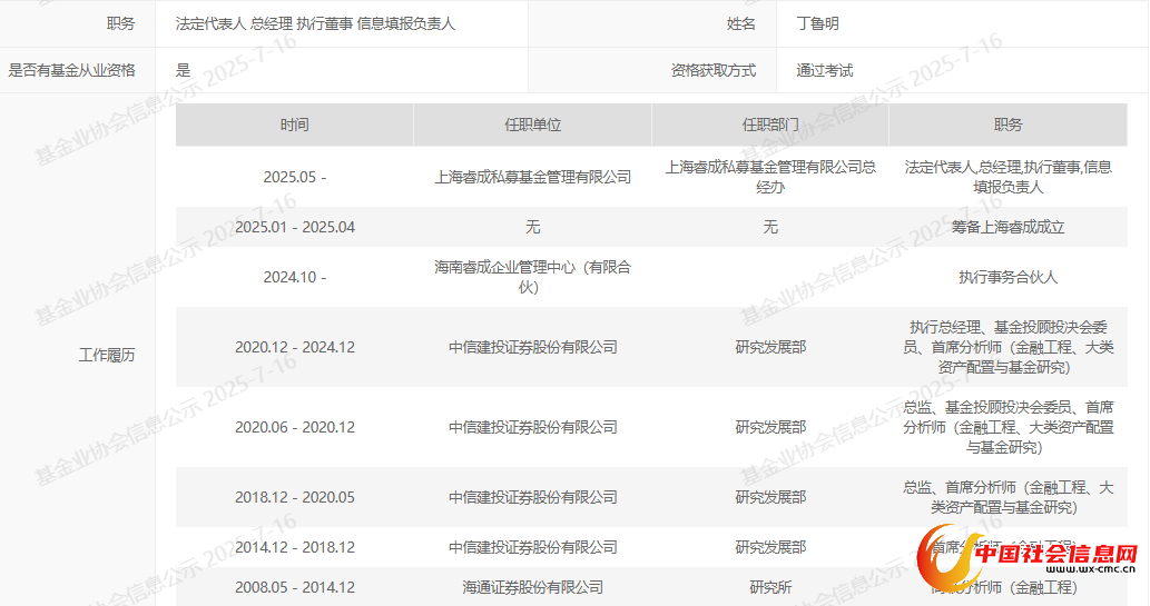 据中基协网站信息,上海睿成基金(全称“上海睿成私募基金管理有限公司”)成立时间为今年4月21日,登记时间是7月14日。丁鲁明为公司实际控制人,身兼法定代表人、总经理、执行董事、信息填报负责人等多个身份。出资人信息方面,丁鲁明为公司大股东,认缴比例为51%,海南睿成企业管理中心(有限合伙)认缴比例为49%。
