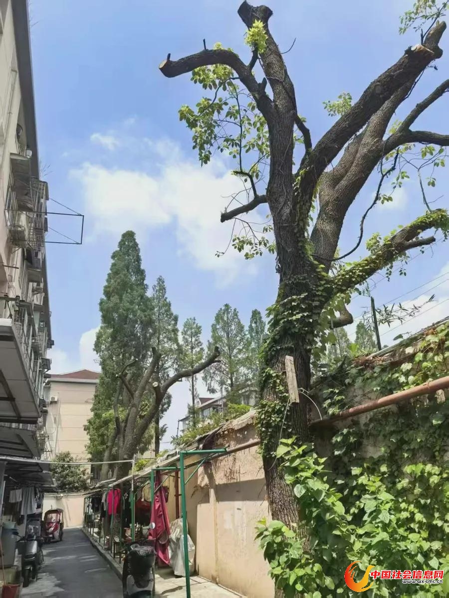 无独有偶,今年4月,松江区江南文化园也有居民投诉,小区多棵树木遭“断头式”修剪。原来,是小区另一户居民多次反映树木影响采光通风,物业才应居民要求进行修剪。
