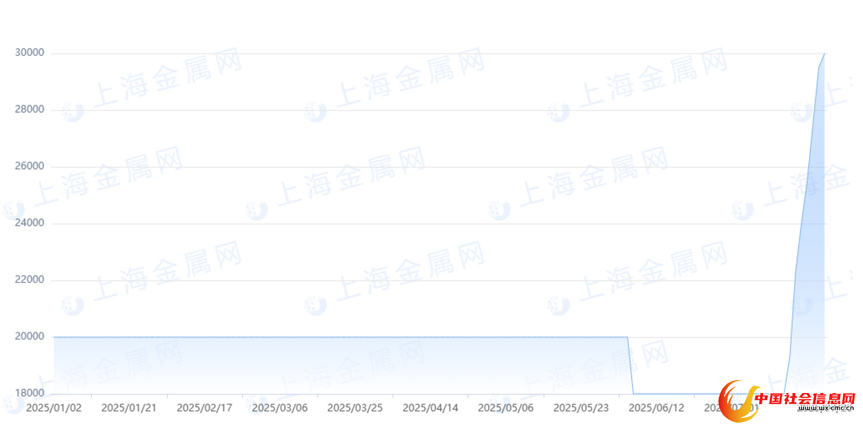 铼(99.99%)2025年的价格走势图,图由上海金属网提供