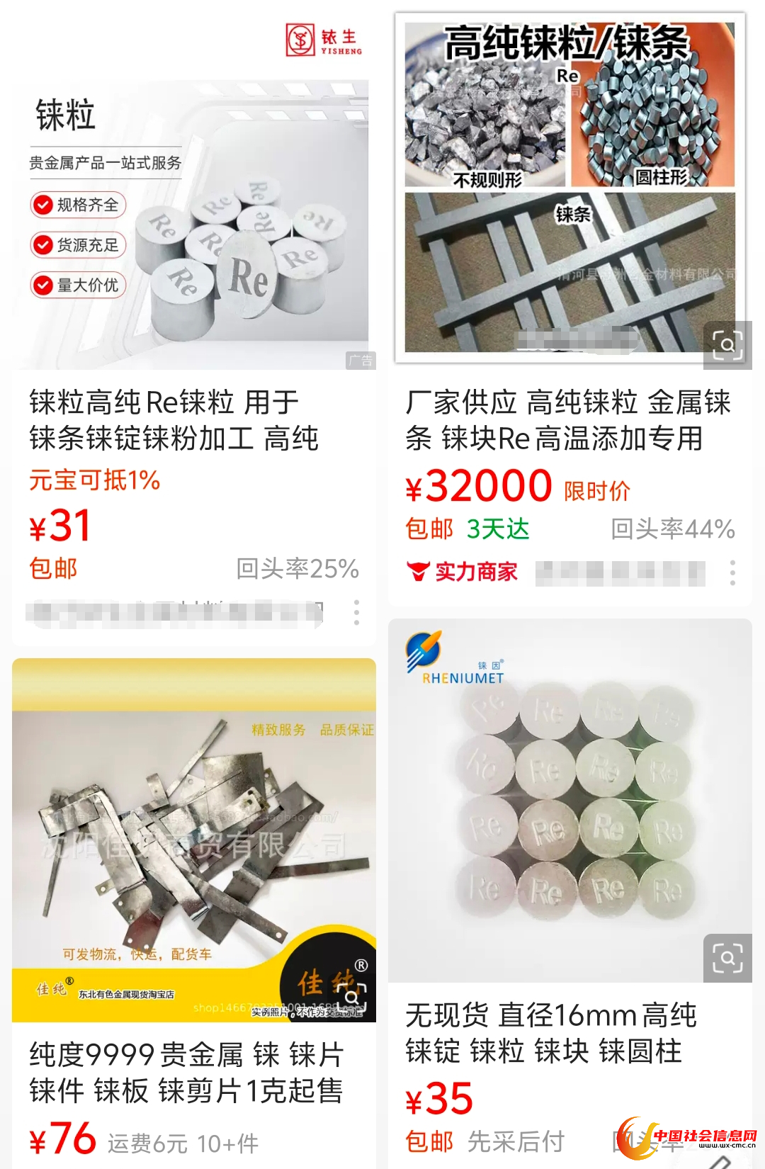 铼粒及铼片等产品,截图自购物平台