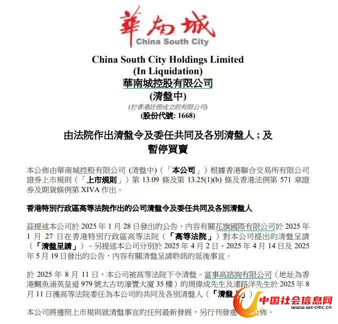 8月11日晚间,华南城(01668.HK)在港交所发布公告称,公司于8月11日被香港高等法院下令清盘。