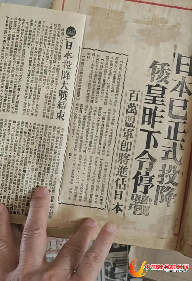 记者接过本子打开,发现其中剪报张贴得密密麻麻,内容均为抗战胜利前夕至日本无条件投降期间的报道。