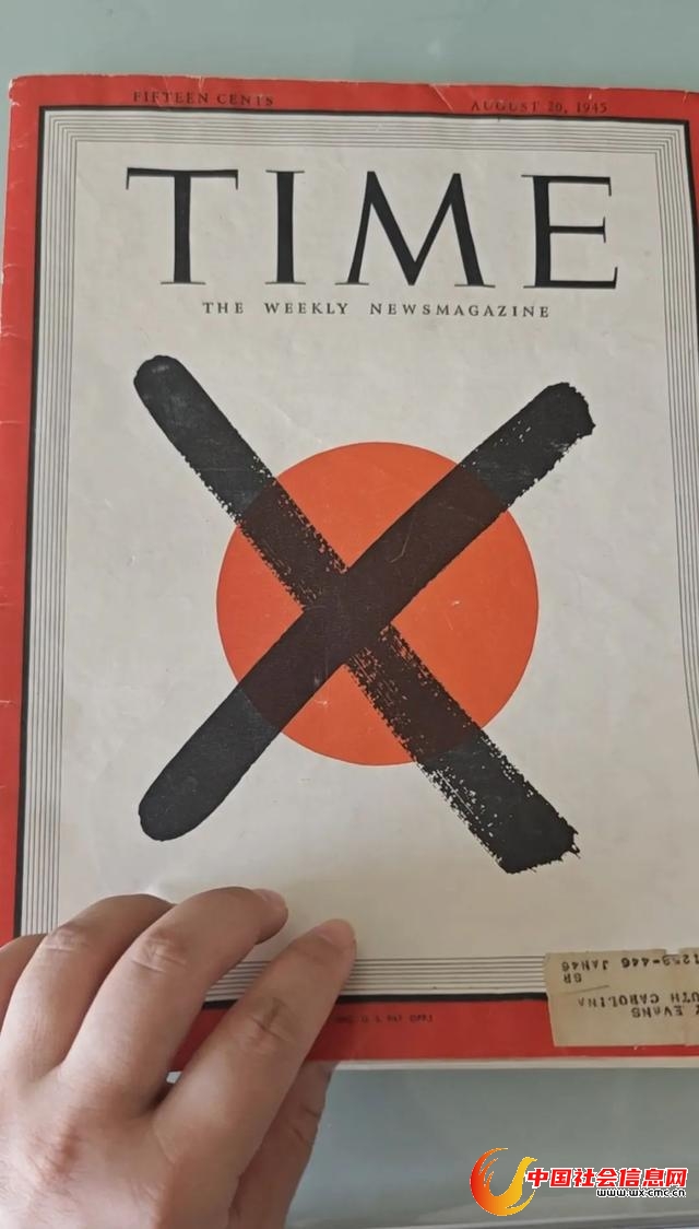 此外,杨翔飞还拿出了珍藏的美国著名时事性周刊之一的《时代周刊》1945年的8月版。这册周刊封面设计看起来似是日本国旗,尤为夺目的是其上的“红日”被画上了墨黑色的“×”。记者翻阅周刊,在其中找到了关于战争结束的内容。