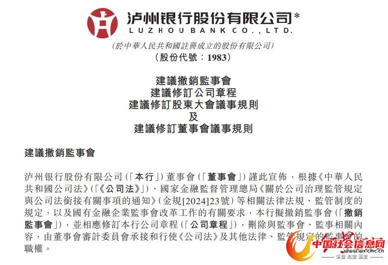 微成都报道近日,泸州银行(01983.HK)发布公告,宣布拟撤销监事会,删除公司章程中监事会和监事相关内容,并由董事会审计委员会承接和行使监事会相关职能。此举拉开了川内银行取消监事会的大幕。