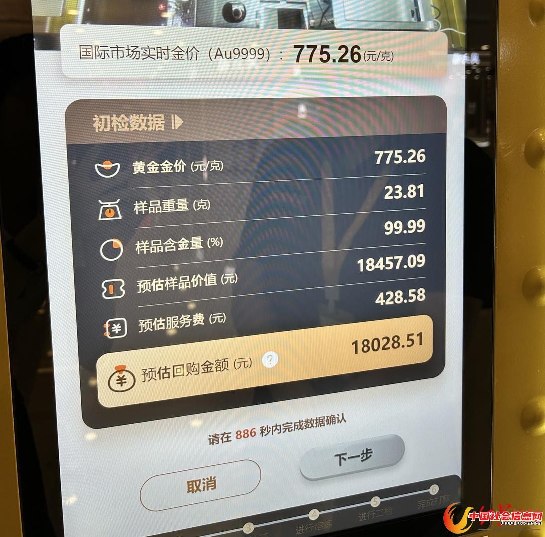 首先是初检,按照机器提醒,微成都将一个金饰放进机器回收闸口,之后等待约3分钟,机器屏幕上便出现了金饰的初检数据,包括黄金金价、样品重量、样品含金量、预估样品价值、预估服务费、预估回购金额等。