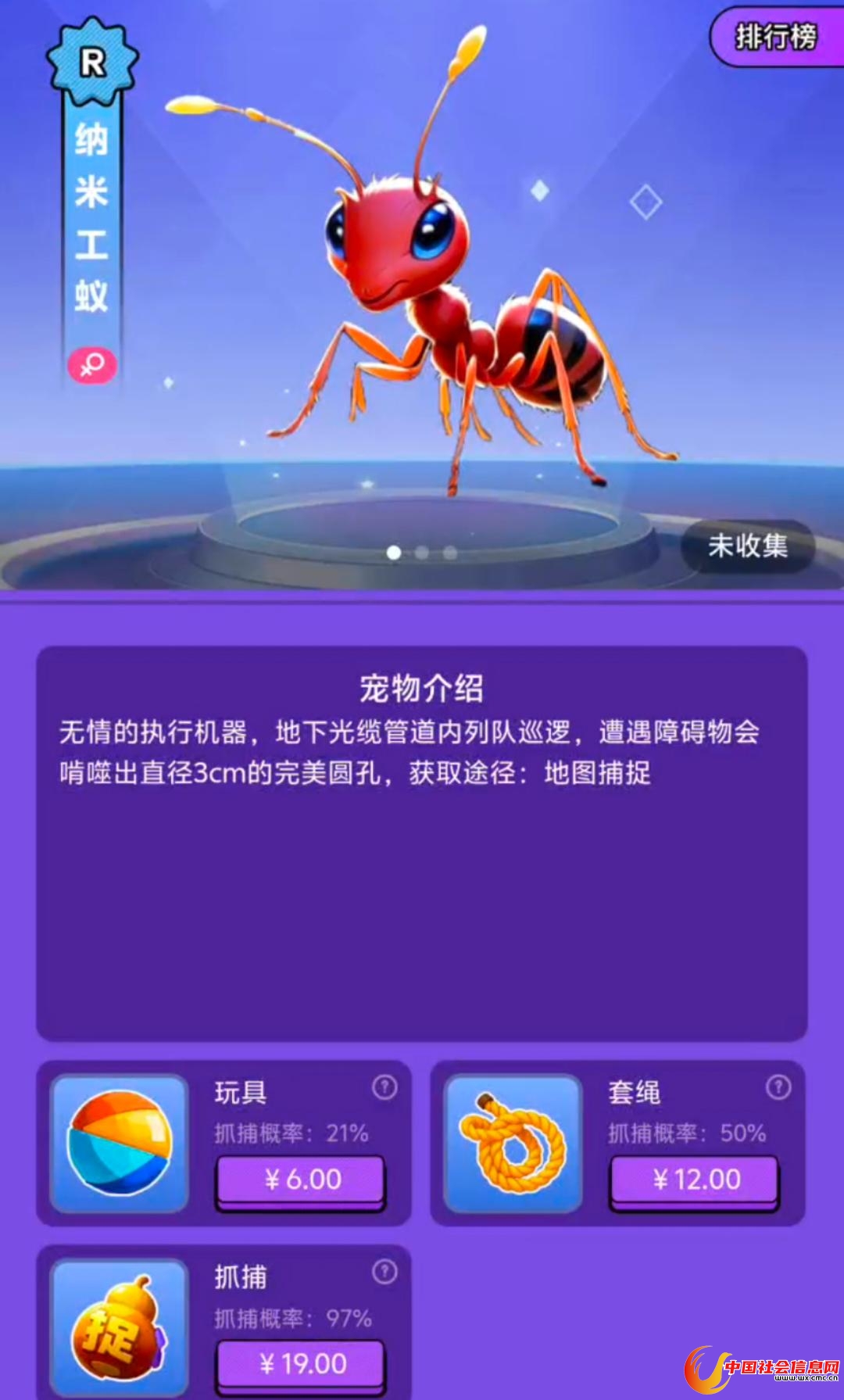 以R级的纳米工蚁为例,用户可以花6元人民币购买玩具诱捕,抓捕成功的概率为21%;也可以花12元购买套绳,成功概率为50%;还可以花19元进行抓捕,成功概率为97%。