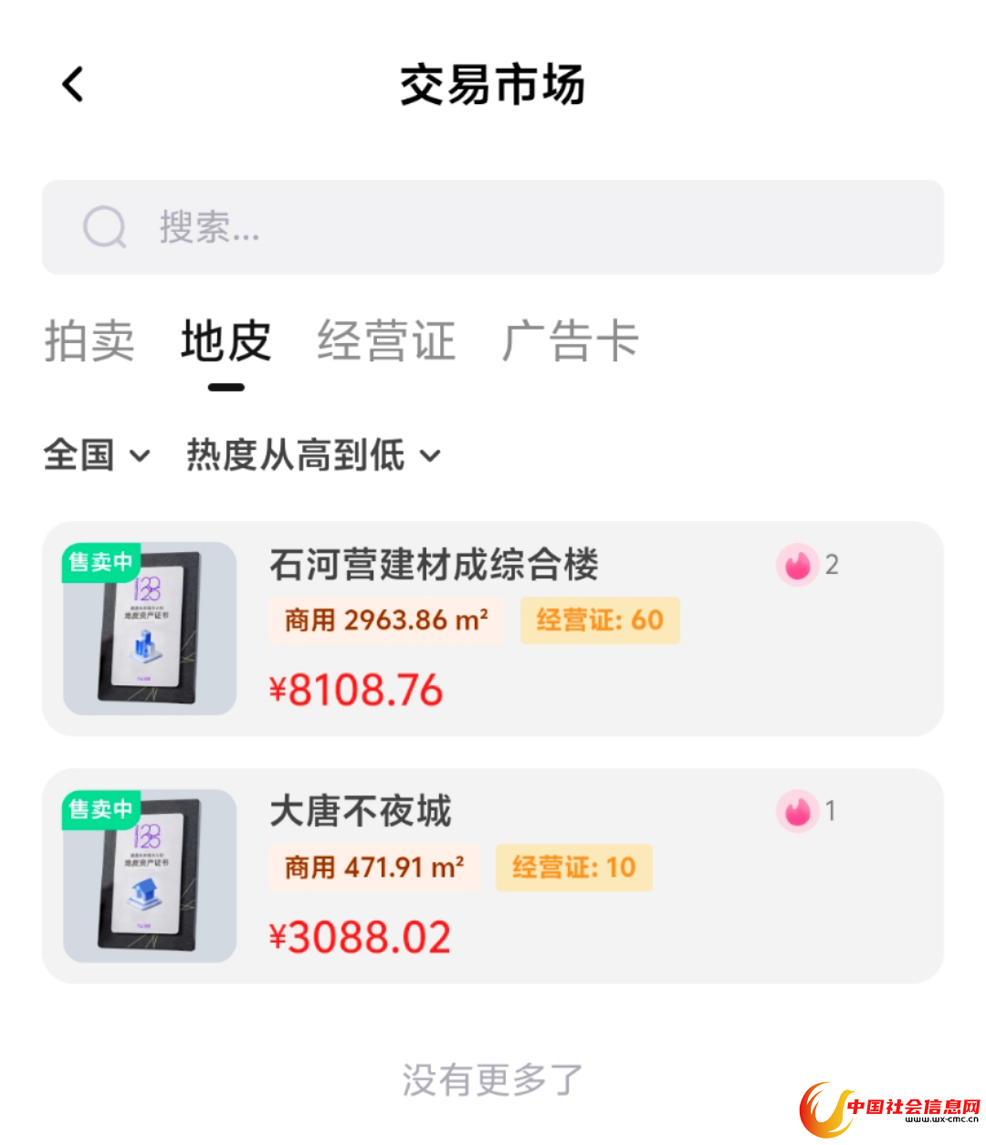 目前,在该APP的交易市场中,仅有两处地皮可以购买,石河营建材成综合楼(售价为8108.76元人民币)、大唐不夜城(售价为3088.02元人民币)。