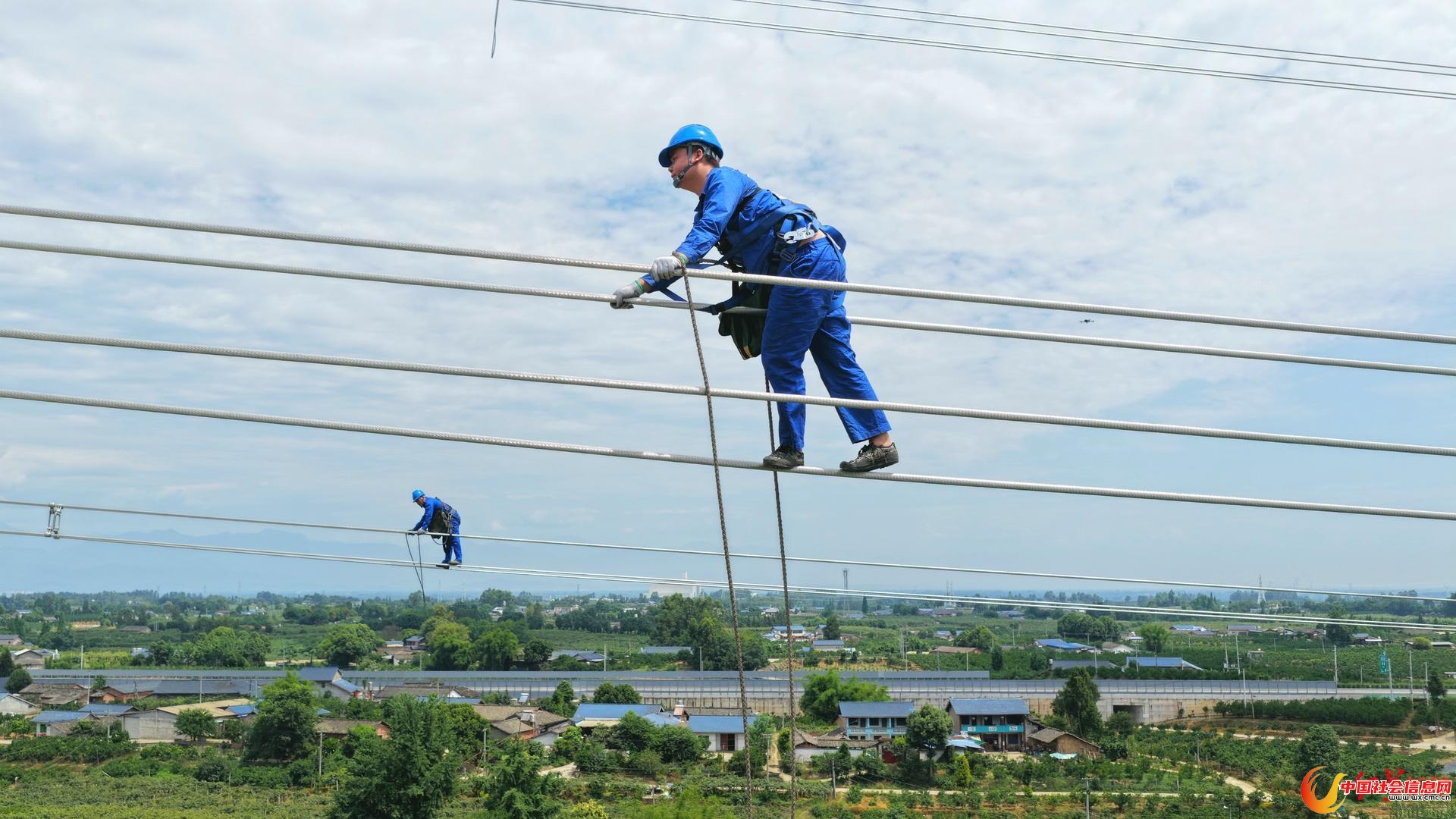 站在70米高空,地面的人影逐渐变得像蚂蚁一样渺小,习惯高空的感觉之后,李乘龙小心翼翼爬上导线,4根一组的导线,让李乘龙有了脚踩和抓握的地方,防滑胶鞋踩在直径6厘米的导线上那一刻,他开始缓步往前走,眼睛扫视着导线的每一寸“肌肤”。