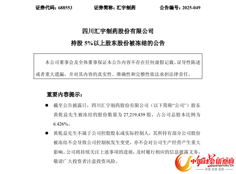 微成都报道6月20日晚间,汇宇制药(688553.SH)发布持股5%以上股东股份被冻结的公告。股东黄乾益被冻结的股份数量为2722万股,占公司总股本比例为6.426%。