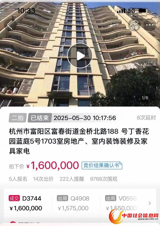 5月30日,一套特殊的房源在法拍平台法拍,它就是位于杭州富阳区的丁香花园蓝庭5号1703室房源。