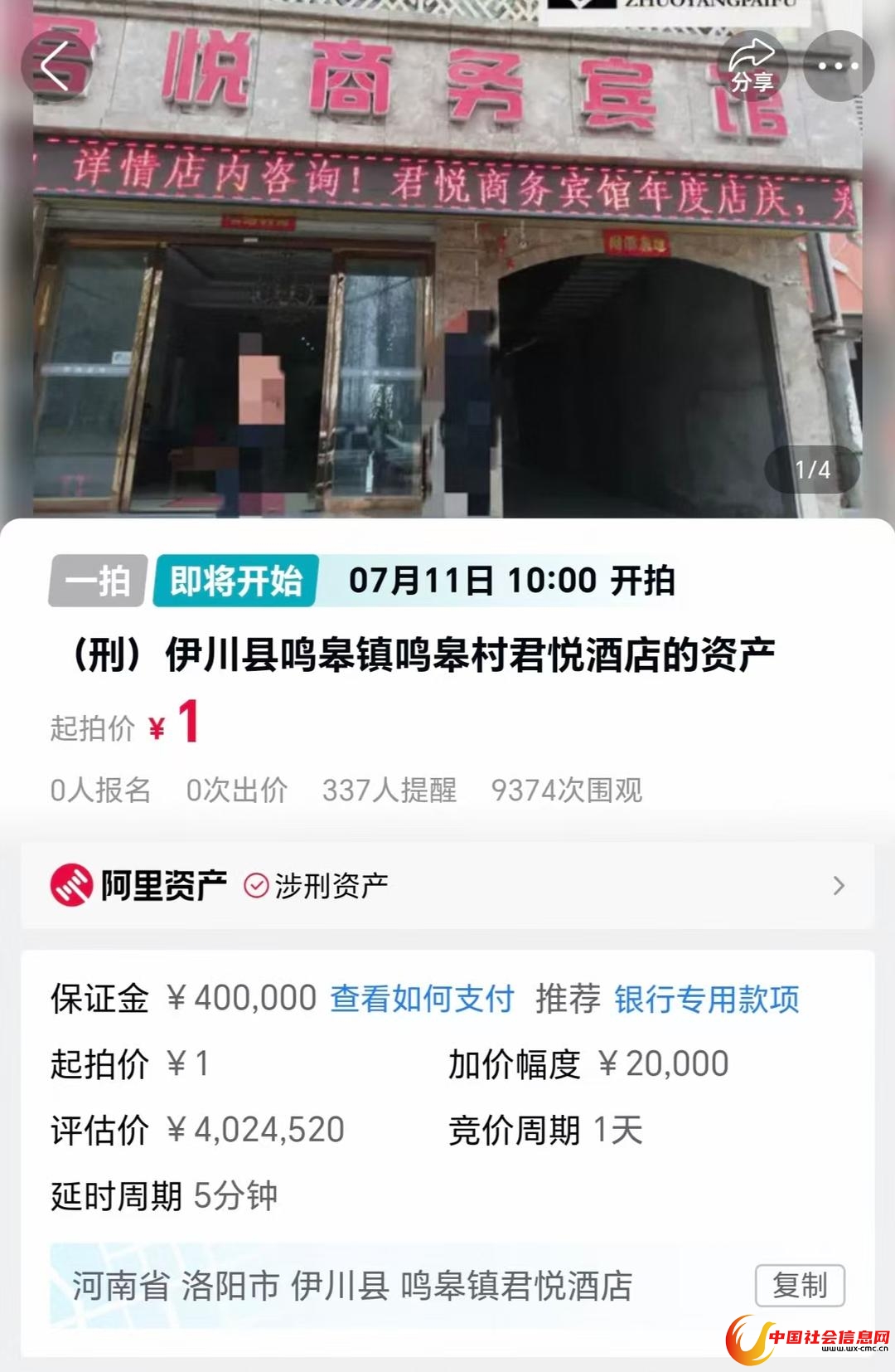 6月28日,红星新闻记者致电拍卖公告上的电话,但因周末无人接听。不过,红星新闻记者注意到,伊川县人民法院在今年1月份曾以281万元的价格对该酒店进行首次司法拍卖,但因无人报名出价而流拍。今年2月,法院对该酒店降价56万元拍卖,再次因无人报名出价流拍。之后,法院直接在司法拍卖平台以225.3万元的价格进行为期60天的变卖,亦因无人报名出价流拍,此次是作为涉刑资产进行无底价拍卖。截至发稿时,共有9300余人围观,337人设置了提醒。