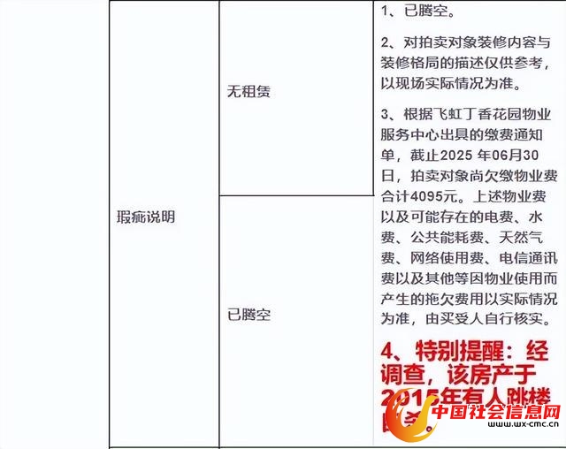 这套房子建成于2007年前后,建筑面积200.73㎡,是一套东边套顶跃,一层格局为二室三厅一厨二卫南北双阳台,二层格局为一室(带书房、走入式衣柜)一卫带一储藏室一阳台两露台。房子评估价222.79万元,但其起拍价仅125万元,相当于不到6折,这个打折幅度比普通法拍房要低,原因何在?答案就在法拍页面的房源说明里,其中有一条红色醒目告知——“特别提醒:经调查,该房产于2015年有人跳楼自杀。”也就是说,这套房子在很多人看来,属于“凶宅”。