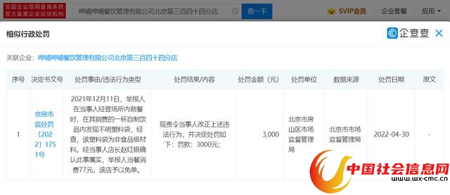企查查APP显示,近日,呷哺呷哺北京第三百四十四分店因顾客在自制饮品内发现不明塑料袋,被北京市房山区市监局罚款3000元。经查,该塑料袋为非食品级材料。经当事人店长确认此事属实,举报人当餐消费77元,该店予以免单。企查查信息显示,该店成立于2019年,总公司为呷哺呷哺餐饮管理有限公司。