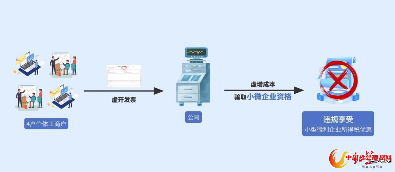 在尹某的一番违法操作下,仁远医疗与4户个体工商户制造了虚假的策划服务业务,由4户个体工商户进行虚开发票,虚增仁远医疗经营成本,将仁远医疗年度应纳税所得额控制在300万元以内,从而获取享受小型微利企业所得税优惠的资格。按照当时的规定,即“小型微利企业年应纳税所得额不超过100万元的部分,减按2.5%的实际税率缴纳企业所得税”,该公司将本应适用25%的企业所得税税率经过“成本调控”成2.5%,以达到少缴税款的目的。