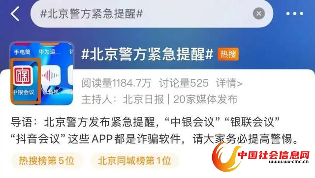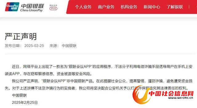 目前,中国银联已发布严正声明,称不法分子诱导用户在手机上安装“银联会议App”应用程序,存在窃取敏感信息、资金被盗等安全风险,“银联会议App”非中国银联产品,请公众谨防诈骗。