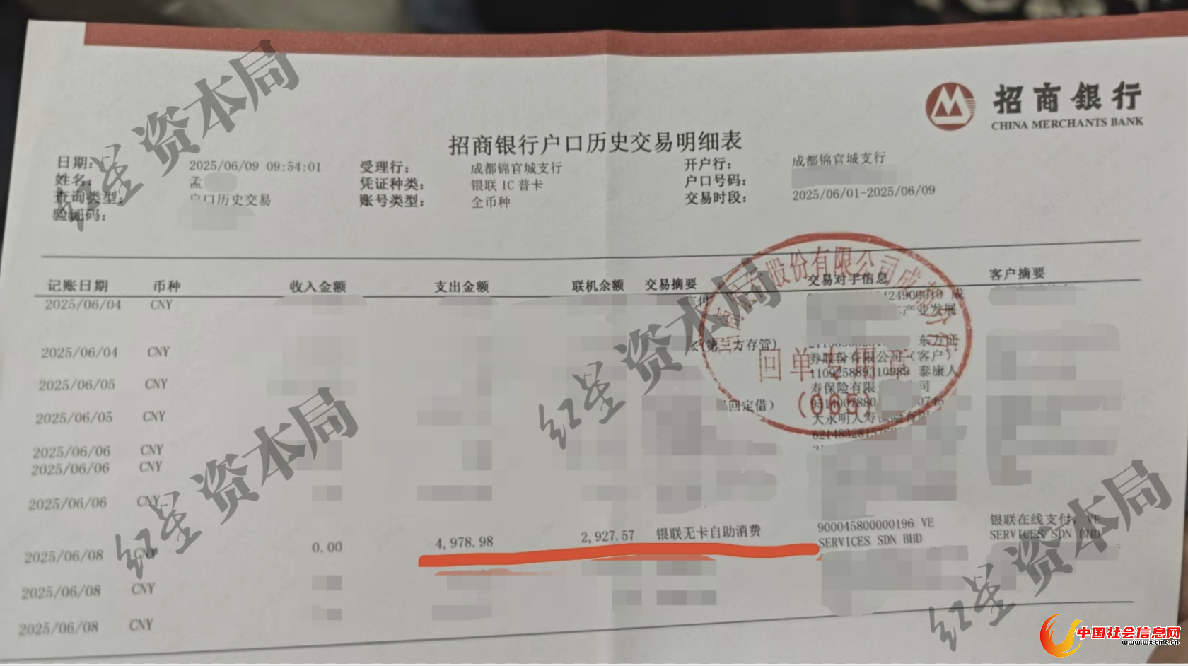 今年5月末、6月初,孟先生前往香港旅游。6月3日,他回到成都,而后,6月8日凌晨,他的招商银行储蓄卡被盗刷,被扣走4978.98元,交易摘要为“银联无卡自助消费”。