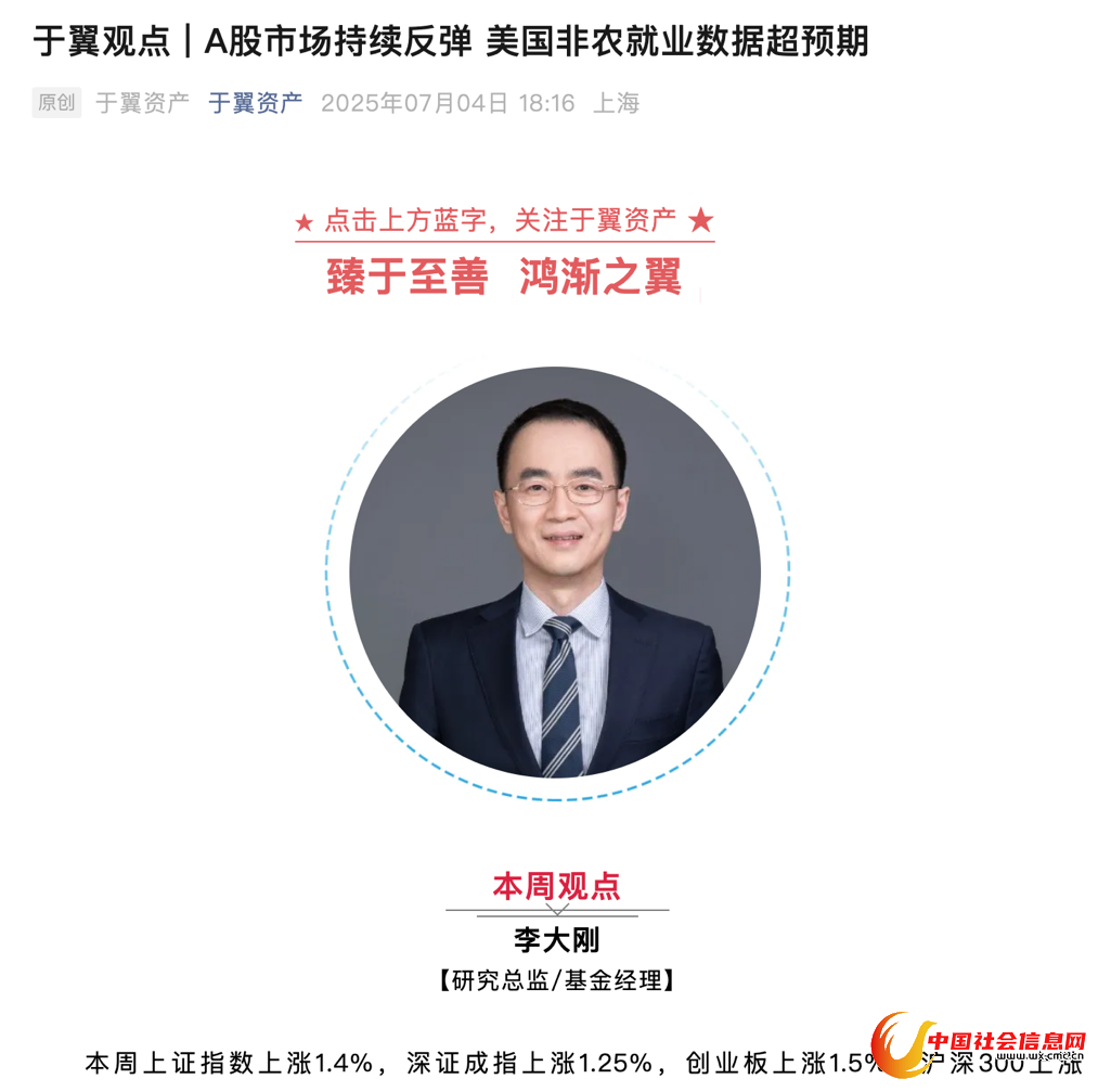 今年7月4日,于翼资产官微发布了一篇来自李大刚的市场观点。李大刚在文中表示,本周(6月30日—7月4日)市场持续上行,结构上有较为明显的“跷跷板效应”。随着美国和世界各国关税谈判最终时间点临近,海外宏观环境将逐渐稳定。“在此背景下,我们认为当前时间点应该逐步聚焦业绩兑现风格,寻找中报业绩亮眼的板块和公司进行布局。”
