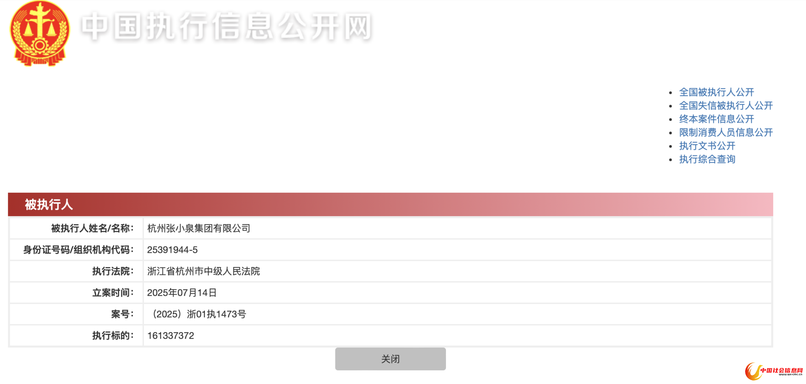 7月16日消息,据中国执行信息公开网信息,近日,杭州张小泉(301055.SZ)集团有限公司新增一条被执行人信息,执行标的1.61亿余元,执行法院为浙江省杭州市中级人民法院。