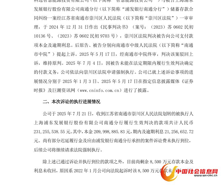 此前,科远智慧子公司公告起诉浦发银行南通分行储蓄存款合同纠纷一案已获得二审胜诉,但在执行环节受阻,本次公告更新了部分执行款的到位。关于诉讼经过,2024年12月31日,南通市崇川区人民法院判决浦发南通分行向科远智慧全资子公司南京科远智慧能源投资有限公司(下称“南京科远”)支付存款本金2.95亿元及逾期利息,诉讼费由银行承担。2025年5月17日,南通市中级人民法院终审维持原判,认定银行未尽到对存款质押的审核义务,需承担全部责任。