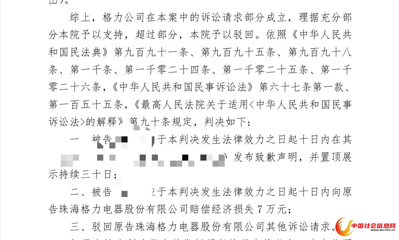最终,横琴粤澳深度合作区人民法院判决小程于该判决发生法律效力之日起十日内在其相关社交账号发布致歉声明,并置顶展示持续三十日。同时,小程应在规定时间内向珠海格力电器股份有限公司赔偿经济损失7万元。
