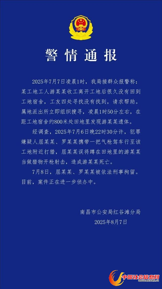 8月7日晚间,南昌市公安局红谷滩分局官微发布警情通报称: