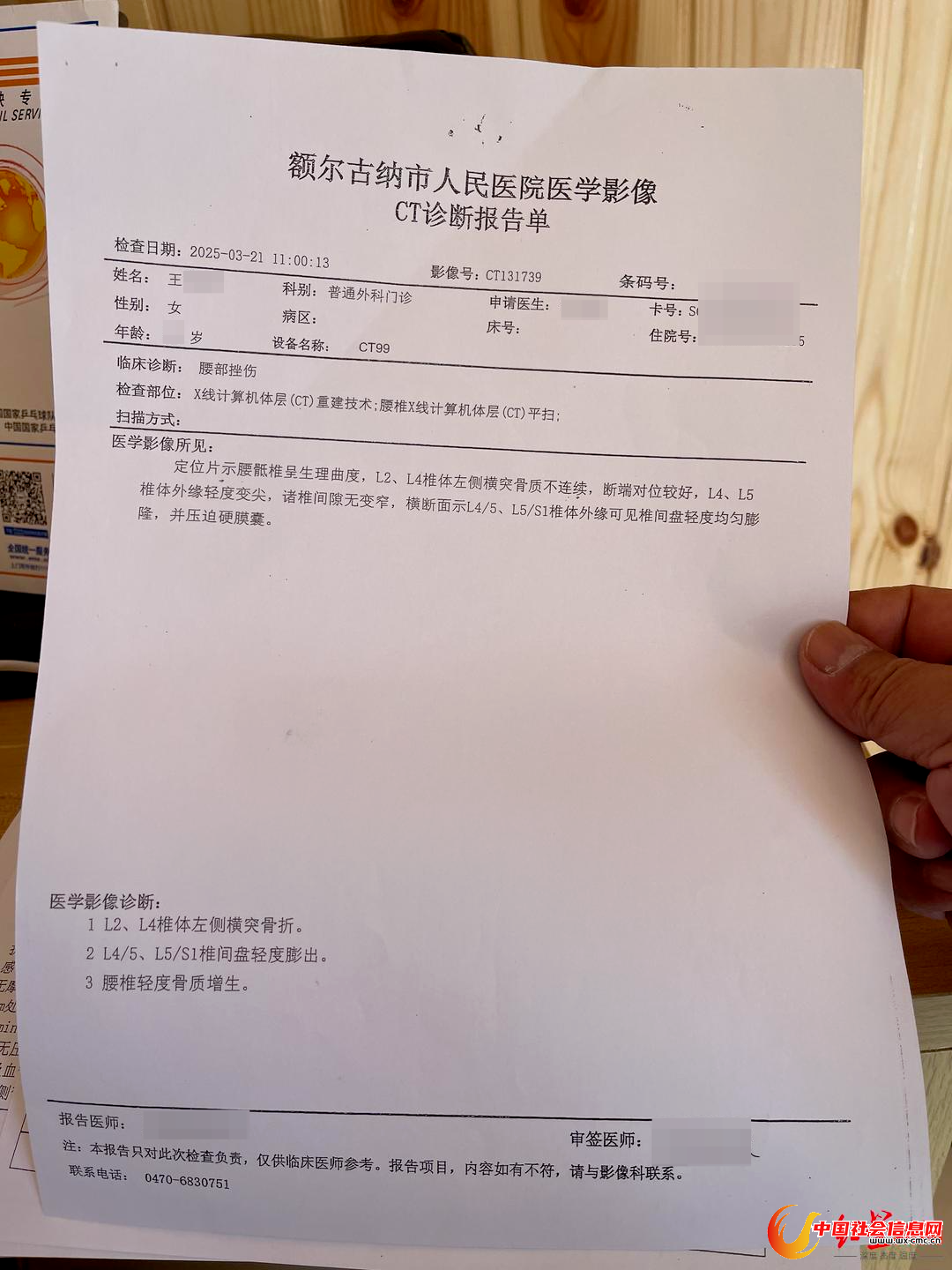 红星新闻记者获取的额尔古纳市人民医院CT诊断报告与入院记录显示,3月21日上午,王可被诊断为L2、L4椎体左侧横突骨折。3月21日下午,王可入院治疗,27日,王可出院。入院记录显示,除腰椎骨折外,另有头部外伤、腰部、上下肢挫伤。