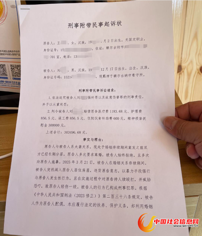 8月8日,法院开庭前4天,王可向法院提交刑事附带民事起诉状,要求依法追究丈夫刘军强奸罪以及故意伤害罪的刑事责任,并予以从重处罚。
