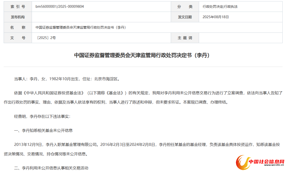 据天津证监局披露,当事人李丹,女,1982年10月出生,住址为北京市海淀区。