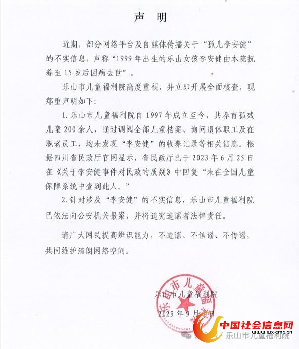 近期,有网传信息称,“1999年出生的乐山女孩李安健由乐山市儿童福利院抚养至15岁后因病去世。”9月1日,乐山市儿童福利院发布声明称,此系不实信息,未在系统中查到此人。