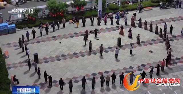 傍晚时分,社区居民吃过晚饭就会来到广场,围在一起跳起藏式广场舞“锅庄”。
