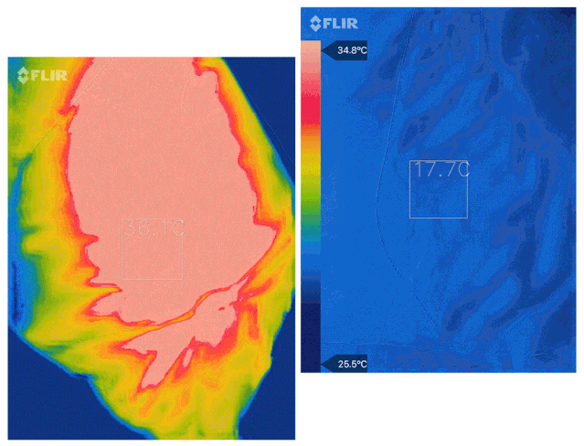 甚至我们直接倒水,被子快速吸湿后,温度更是下降到了13.5°