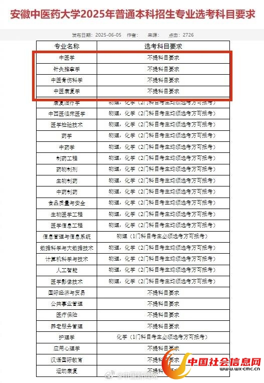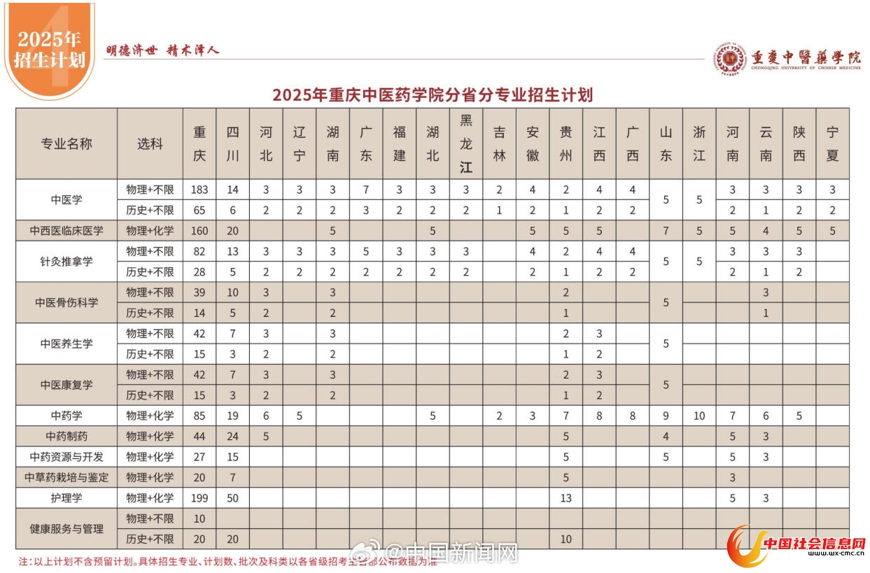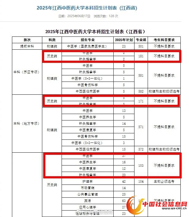 2025年重庆中医药学院分省份专业招生计划显示,该校中医学、针灸推拿学、中医骨伤科学、中医养生学等,招生选科要求为历史+不限。江西中医药大学2025年本科批次招生专业选考科目要求一览表显示,中医学、中医养生学、针灸推拿学、中医康复学、中医骨伤科学不再对考生提出科目要求。