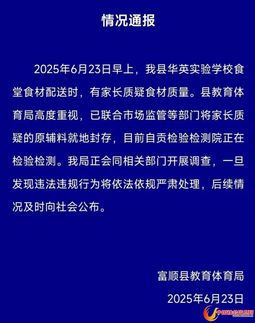 当天下午,富顺县教育体育局发布情况通报称,该县华英实验学校食堂食材配送时,有家长质疑食材质量。县教育体育局高度重视,已联合市场监管等部门将家长质疑的原辅料就地封存,目前自贡检验检测院正在检验检测。该局正会同相关部门开展调查,一旦发现违法违规行为将依法依规严肃处理,后续情况会及时向社会公布。