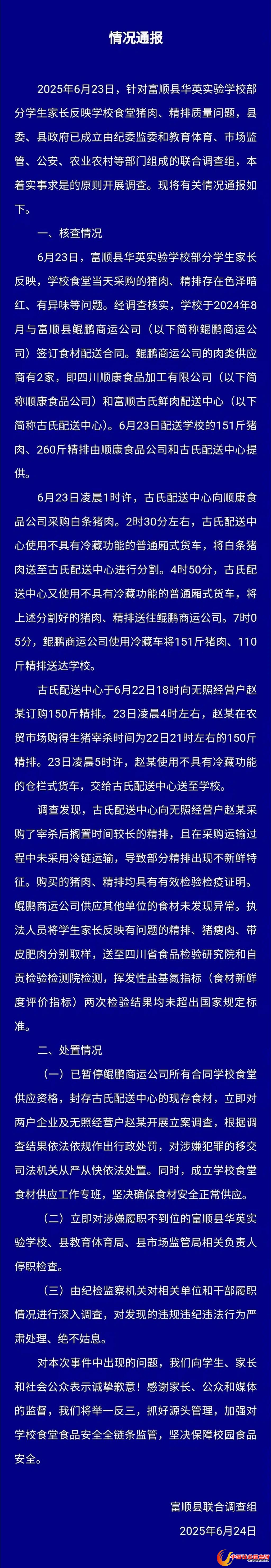 通报指出,目前已暂停鲲鹏商运公司所有合同学校食堂供应资格,封存古氏配送中心的现存食材,立即对两户企业及无照经营户赵某开展立案调查,根据调查结果依法依规作出行政处罚,对涉嫌犯罪的移交司法机关从严从快依法处置。同时,成立学校食堂食材供应工作专班,坚决确保食材安全正常供应;对涉嫌履职不到位的富顺县华英实验学校、县教育体育局、县市场监管局相关负责人停职检查;由纪检监察机关对相关单位和干部履职情况进行深入调查,对发现的违规违纪违法行为严肃处理、绝不姑息。