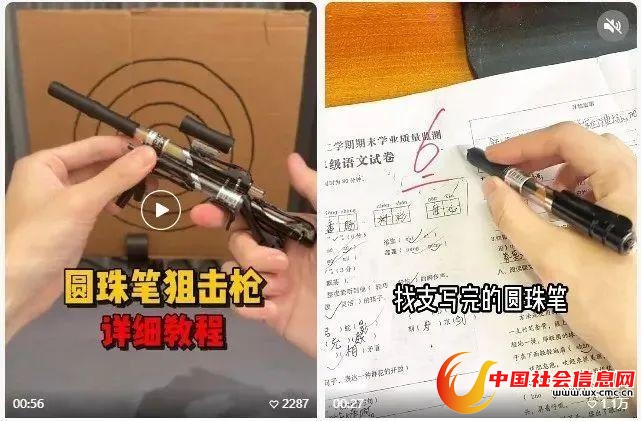 经过询问,她才知道孩子是从相关视频教程里学来的,“他说班上有孩子在近距离弹射时,脸部皮肤都被戳破了。我觉得这实在太危险了,万一伤到眼睛就完了。”张女士得知事情的来龙去脉后,严厉禁止孩子再用中性笔组装“笔枪”,同时立即向任课老师反映。