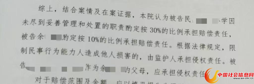 5月26日,上海市闵行区人民法院作出一审判决,由小余家属承担10%赔偿责任,学校承担30%赔偿责任。