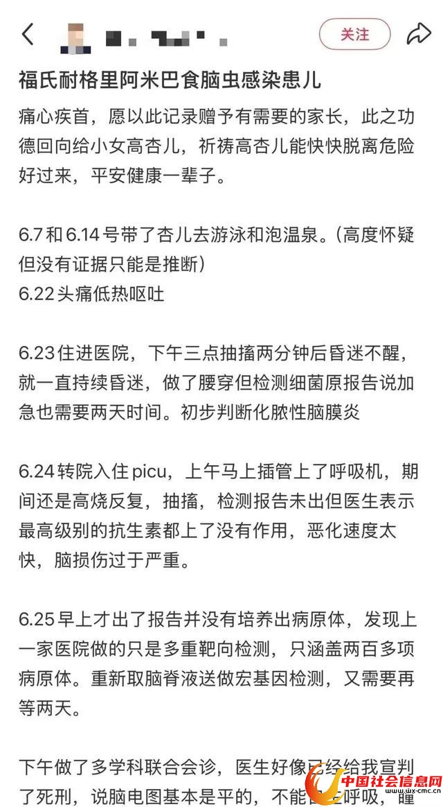 此前,一名5岁女童家长在社交平台的求助信息引起广泛关注。家长称女孩于6月7日和6月14日游泳和泡温泉,6月22日出现头痛低热呕吐的情况,6月23日住进医院后出现抽搐,随后昏迷不醒,并转入重症监护室治疗,6月27日被检测出福氏耐格里阿米巴病原,情况非常危急。