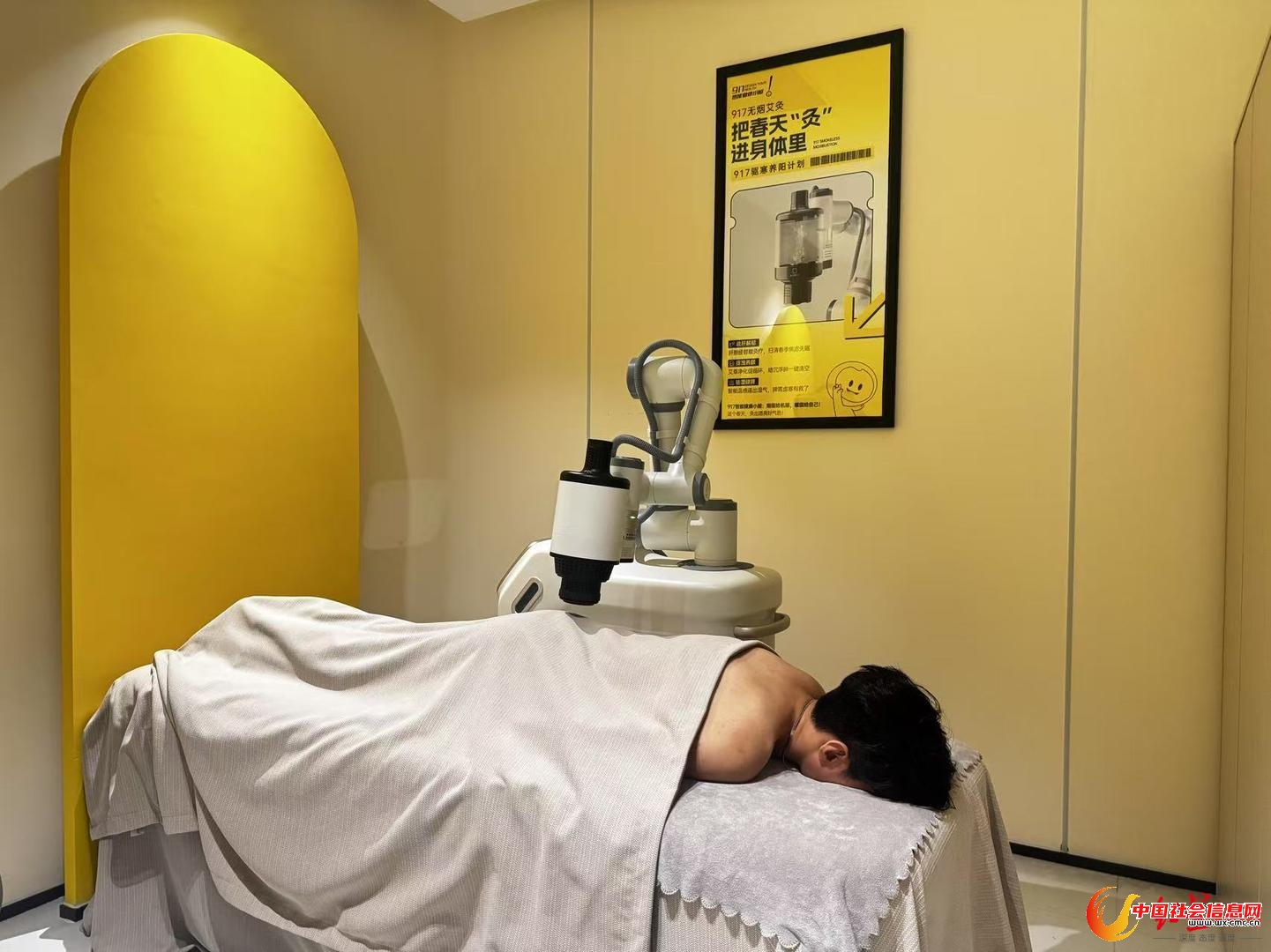在成都市成华区“917智能健康小屋”内,红星新闻记者观察到,搭载3D视觉的机械臂正沿人体曲线缓缓移动并“寻穴定位”,当店长蒲若溪在控制屏上选定“温肾祛寒”,工业级六轴机械臂随即复刻出传统艾灸手法。
