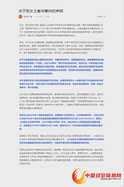 近日,部分媒体刊载一篇题为《女律师十年体检未有“患癌风险”预警,确诊已是肾癌晚期》的文章,表述客户张女士于2013年~2023年连续10年在爱康体检,血液肿瘤标志物癌胚抗原(CEA)检测结果均在正常范围;但张女士在2024年被诊断右肾透明细胞癌并转移,进行右肾摘除手术,故张女士对爱康先前十年的检测结果提出质疑与投诉。