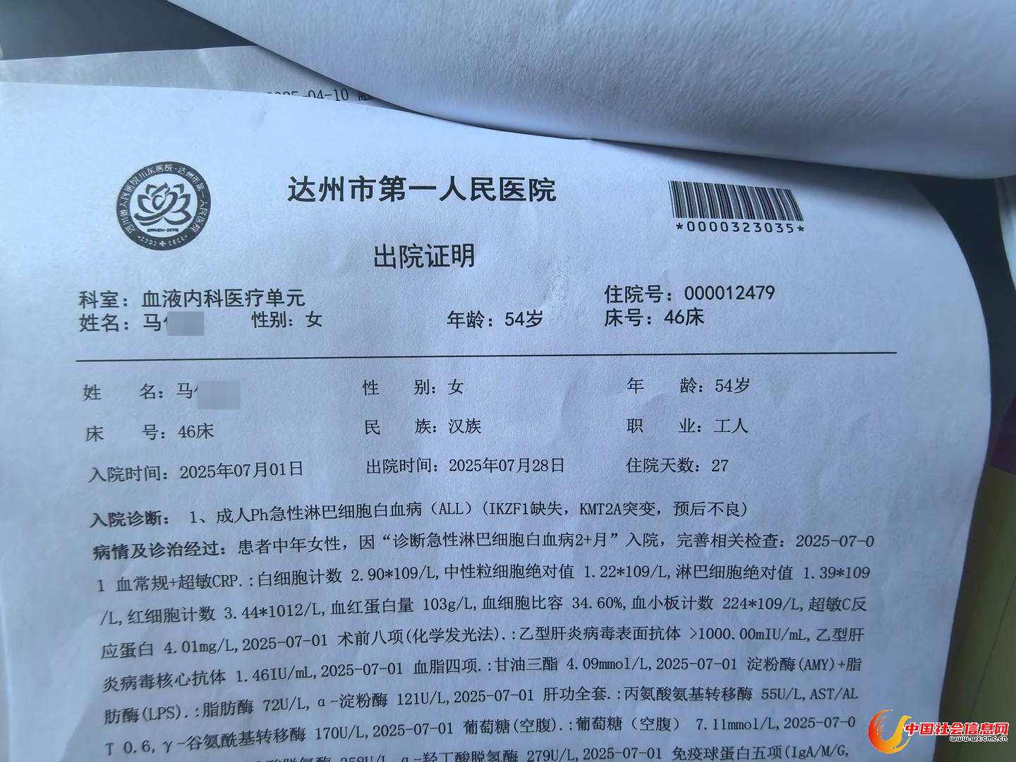 近日,巴中市平昌县一位单身妈妈患白血病求助的信息在网络上转发,这位母亲与自己17岁的女儿配型成功,50万元左右的医疗费用难倒了母女俩。 7月29日,红星新闻记者与马女士取得联系,确认其患白血病的事实。7月30日,记者前往平昌马女士家了解其家庭情况,看到了母女俩配型成功的资料和住院病历。 据马女士住院的达州市第一人民医院的医生介绍,马女士患急性白血病,已经住院化疗3次,建议其尽快手术。 针对马女士的情况,红星新闻记者联系了平昌县同州街道办事处。据办事处工作人员表示,建议马女士准备资料看是否能享受政策照顾。