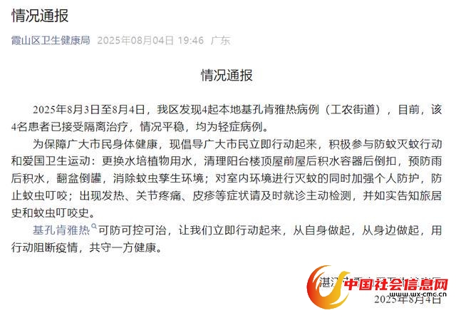 广东省湛江市霞山区卫生健康局通报,8月3日至8月4日,霞山区发现4起本地基孔肯雅热病例(工农街道),目前,该4名患者已接受隔离治疗,情况平稳,均为轻症病例。