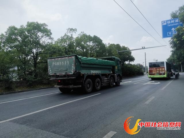 军工路上土方车往来频繁,双向车道间的隔离带绿化高大,极易遮挡驾驶员视线。陈浩摄